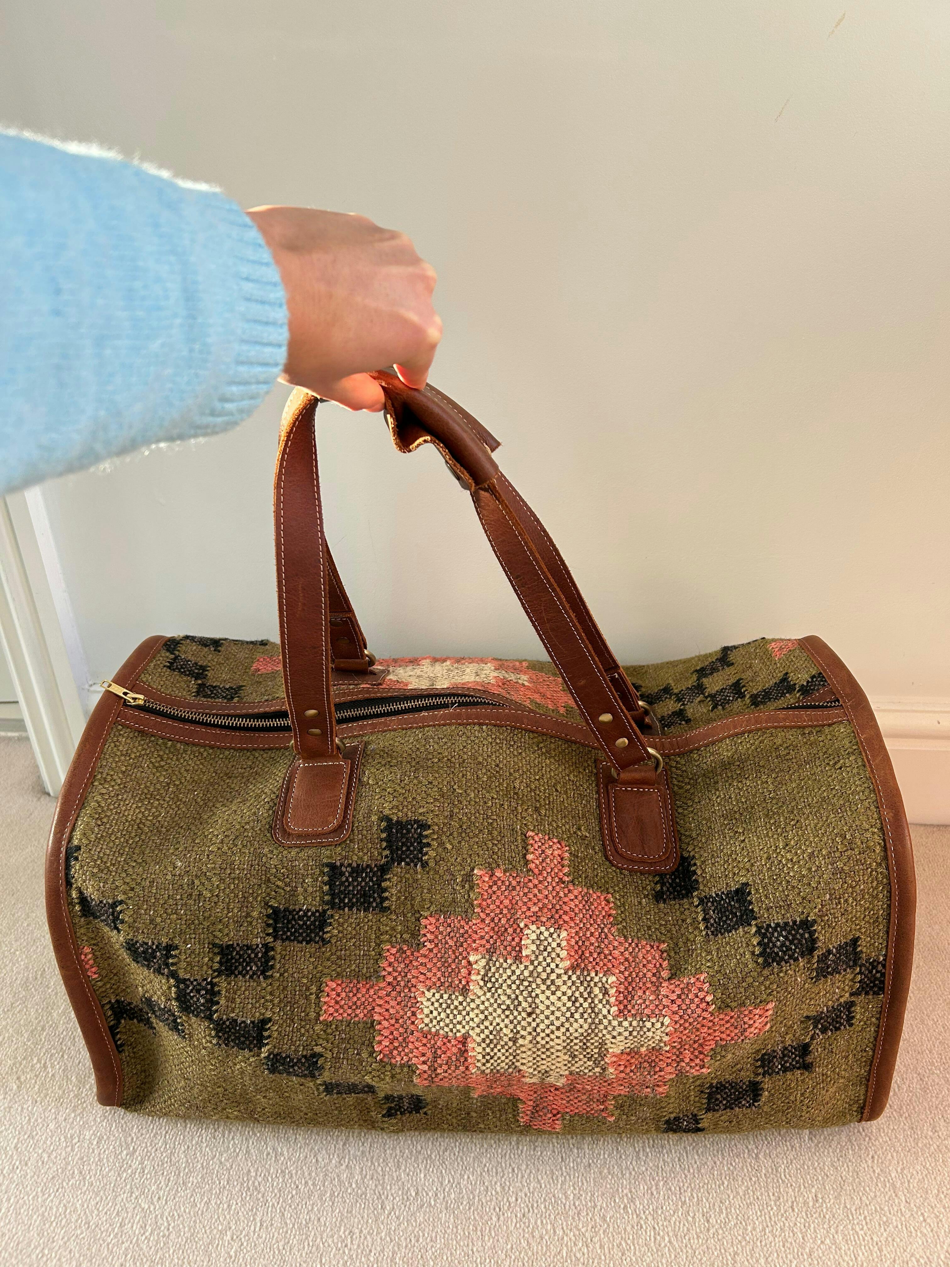 Handmade from a jute kilim rug and finished with buffalo leather straps and trims, the Cotswold Duffle combines relaxed style with timeless luxury. Featuring a plain brown cotton lining with two leather-trimmed internal pockets, one zipped and one open - it’s as practical as it is beautiful.